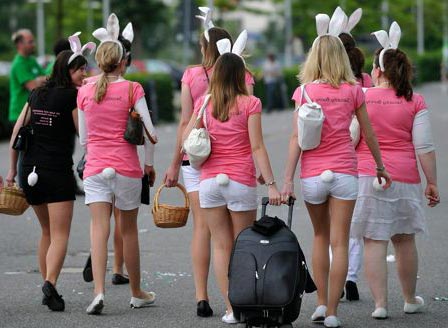 Girls walk past soccer stadium as they arrive for hen’s night party in Wolfsburg