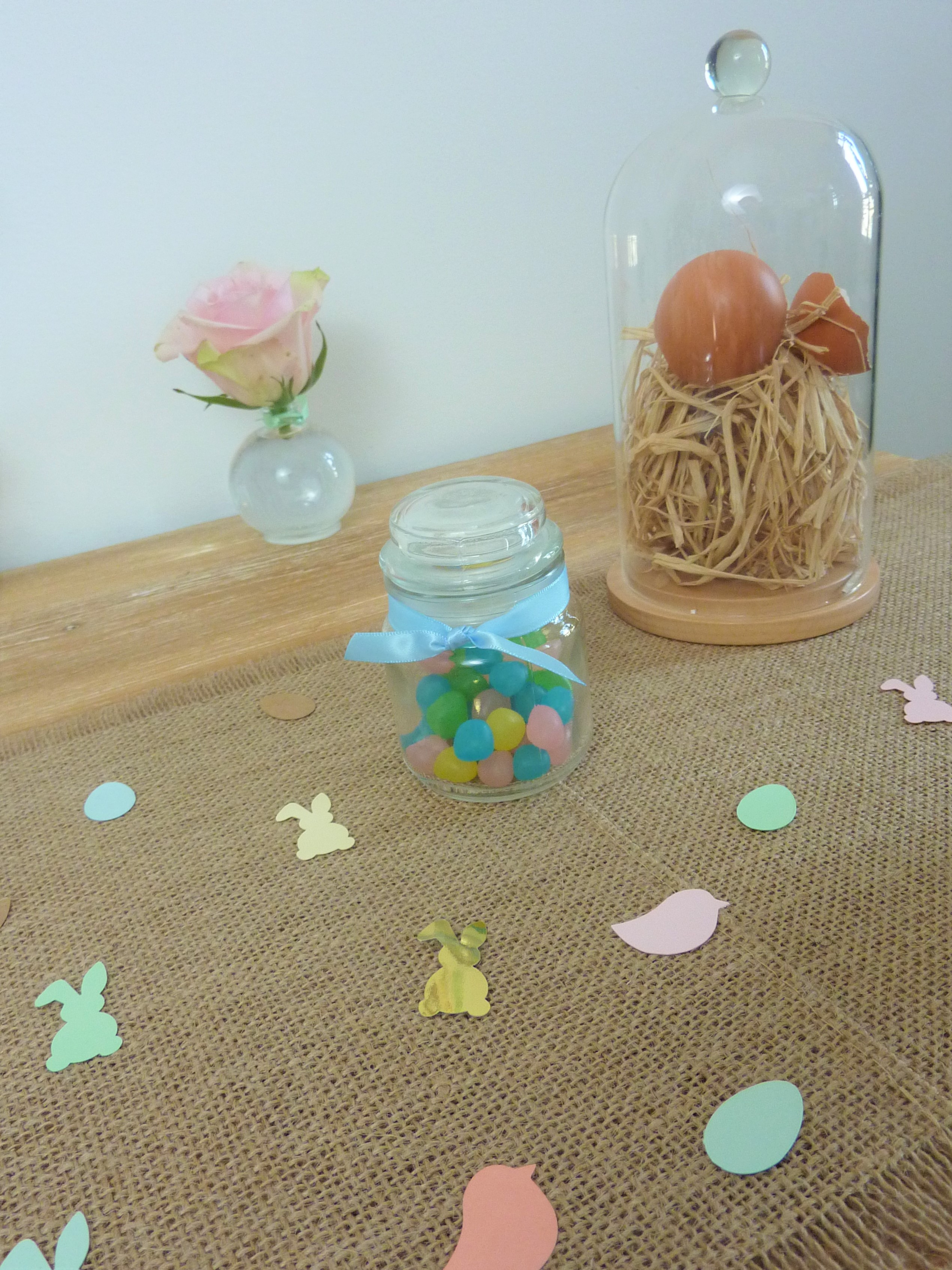 Bonne idée : Pour compléter la décoration et coller au thème de Pâques, on a créé des petits nids d’œufs véritables avec des coquilles d’œufs que nous avons récupérées et lavées et un peu de raphia naturel. Une activité facile à réaliser de surcroît avec les pitchounes !